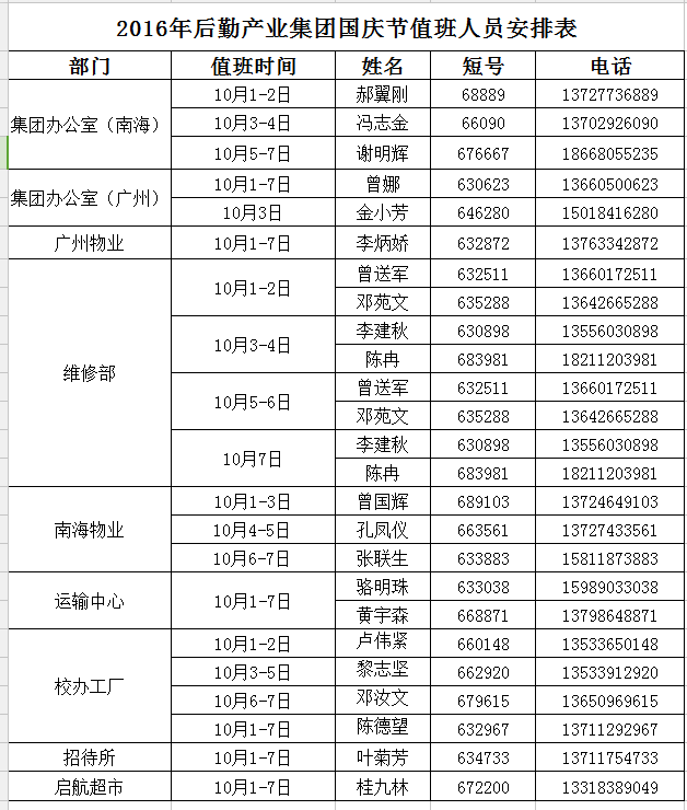 2016年国庆节后勤产业集团两校区值班安排